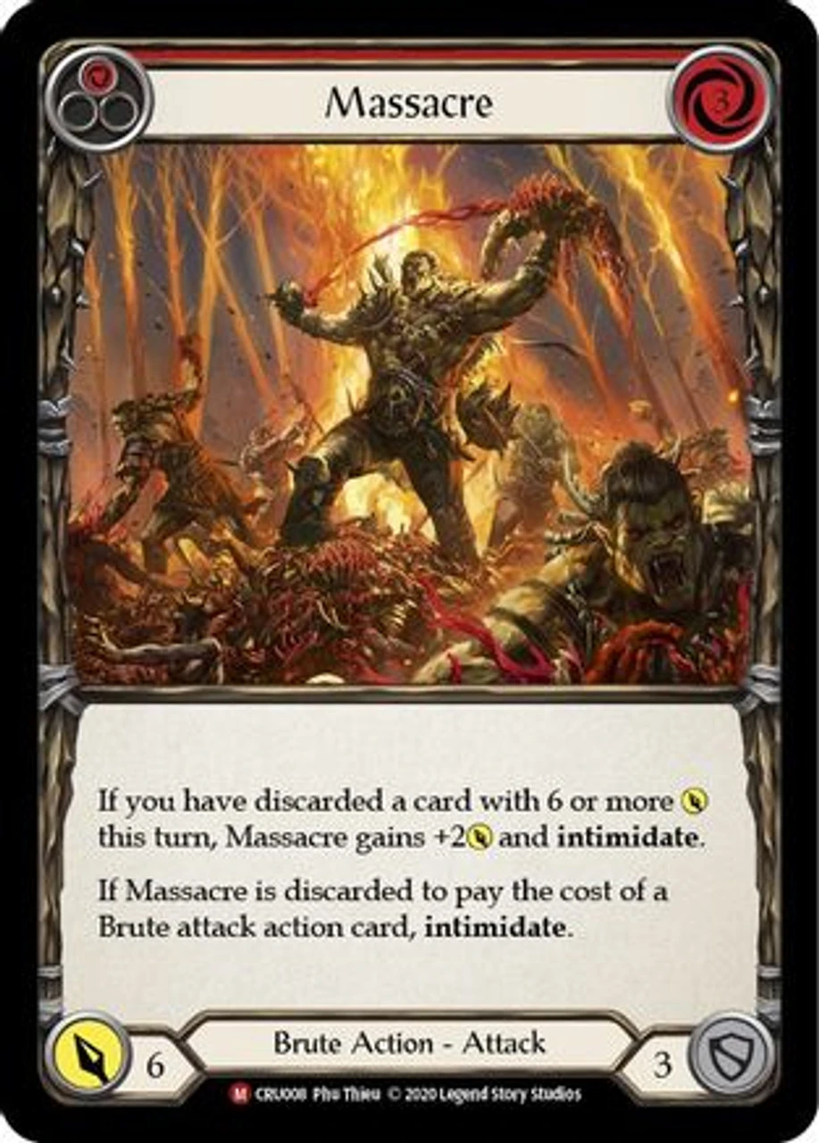 If Massacre is discarded to pay the cost of a Brute attack action card, the attack gains intimidate.