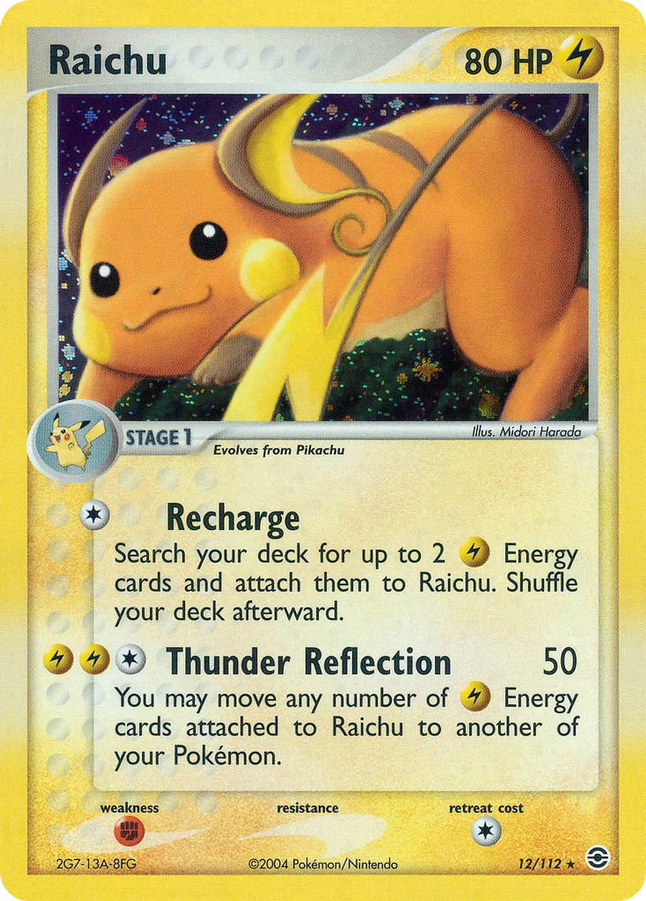 Search your deck for up to 2 Lightning Energy cards and attach them to Raichu. Shuffle your deck afterward.